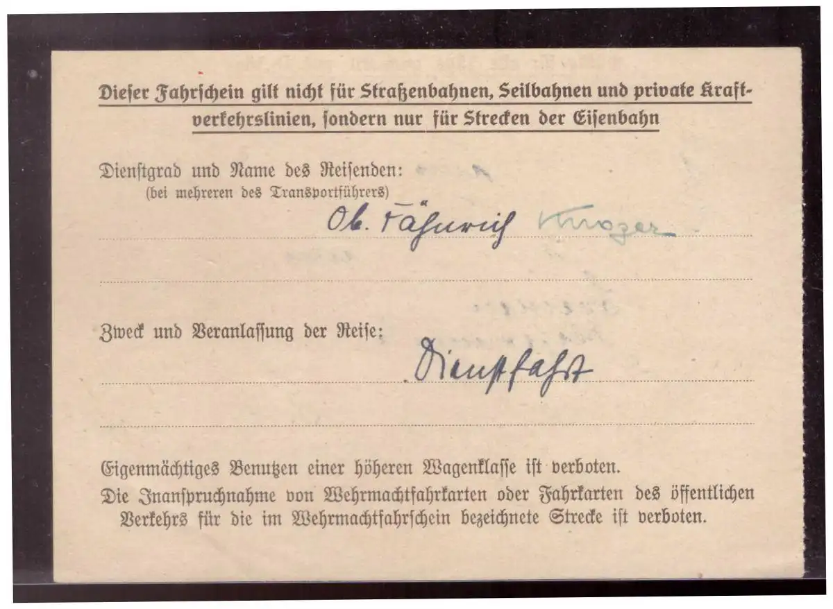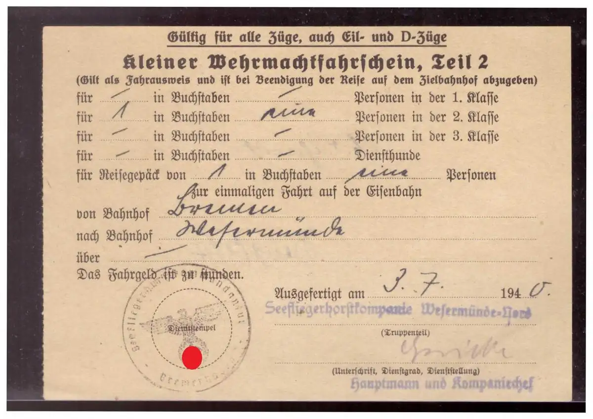 Dt- Reich (020278) Kleiner Wehrmachtsfahrschein Teil 2 Seefliegerhorstkompanie Wesermünde- Nord vom 3.7.1940