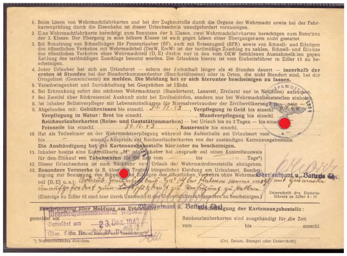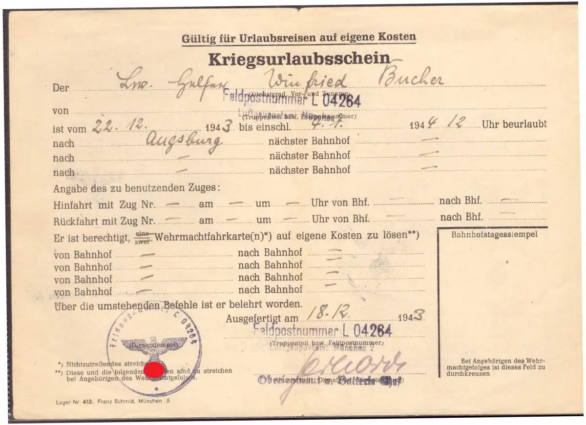 Dt- Reich (020310) Kriegsurlaubschein FPNR L 04264 vom 8.12.1943