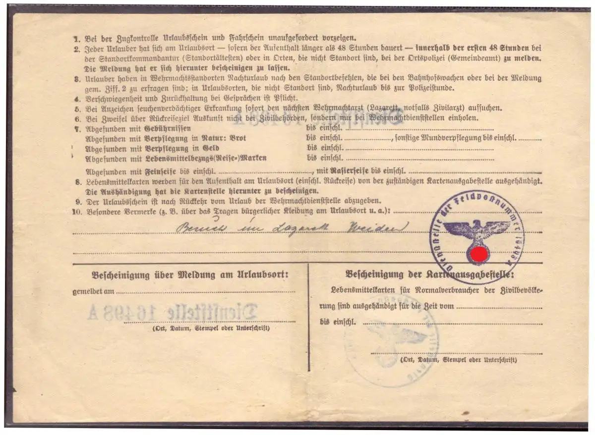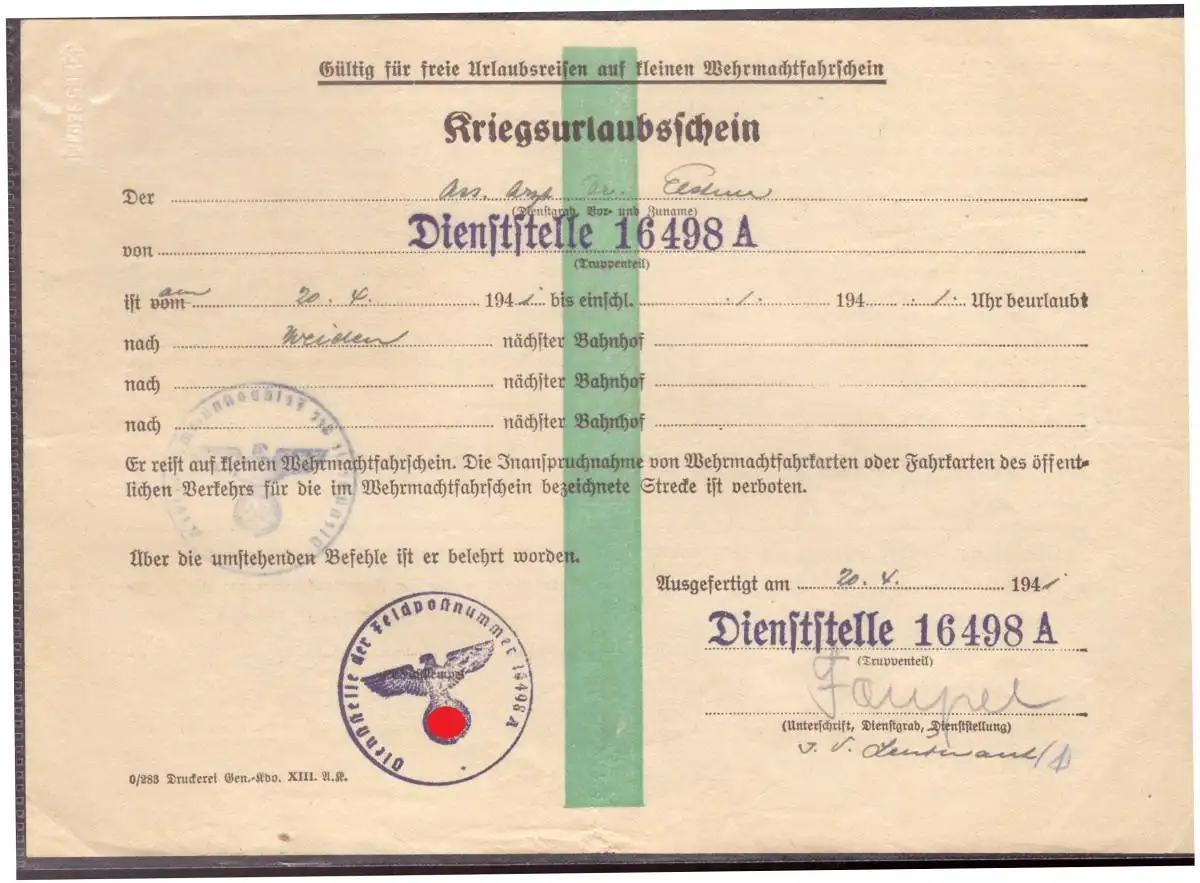 Dt- Reich (020314) Kriegsurlaubschein Dienststelle 16498A vom 20.4.1941