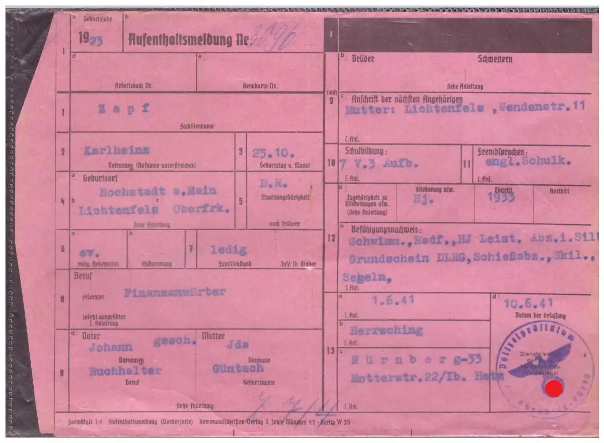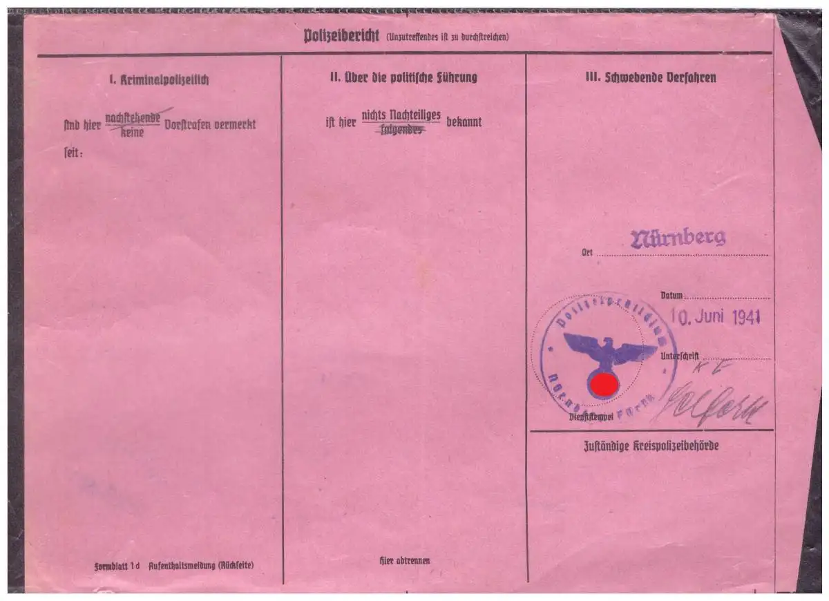 Dt- Reich (020318) Aufenthaltsmeldung für Nürnberg vom 10.6.1941