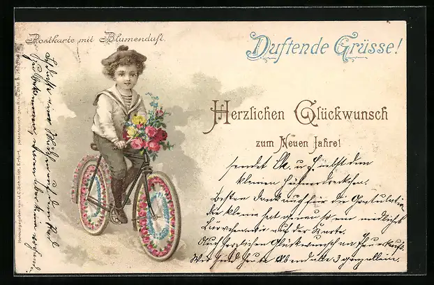 Duft-AK Junge im Matrosenanzug fährt auf blumengeschmücktem Fahrrad
