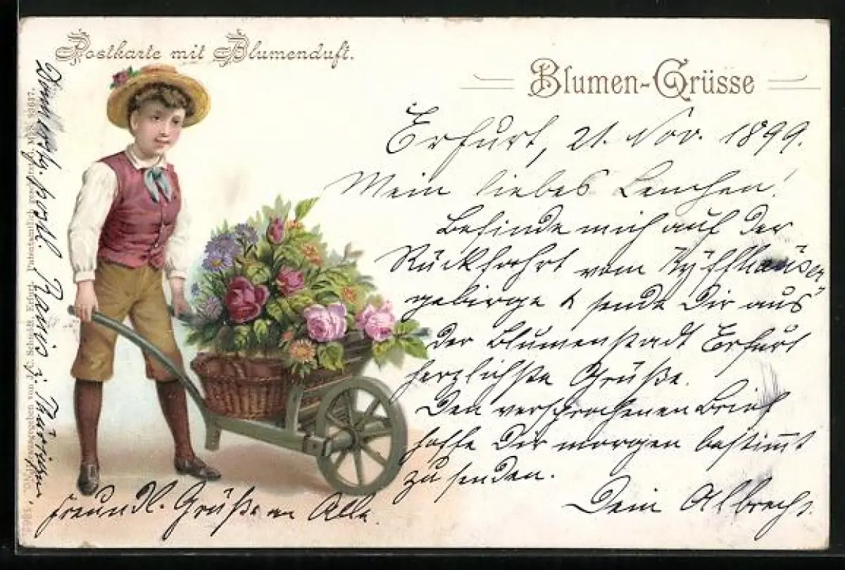 Duft-AK Knabe mit Schubkarre voller Blumen
