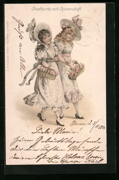 Duft-AK Zwei junge Damen mit Blumenkörben mit Rosenduft