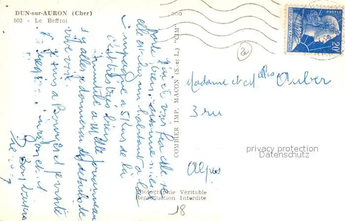 Dun-sur-Auron Le Beffroi Dun-sur-Auron postalisch gelaufen 1959 Erhaltung siehe scans [FriedD77] Frierer