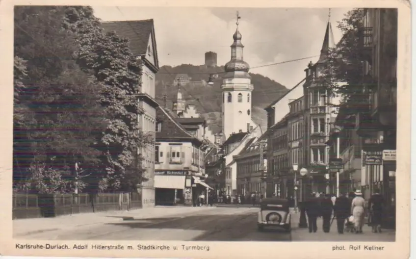 Durlach (Karlsruhe) Pfinztal-Straße mit Stadtkirche und Turmberg gl1943 225.859