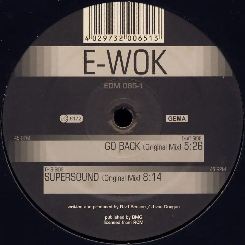 12" Maxi E-Wok - Go Back / Supersound, Einheitscover der Plattenfirma, Zustand Platte VG+ Hülle VG+; Made in Germany 2002 EDM EDM 065-1, Tracks Go Back [Original Mix] 5:26, Supersound [Original Mix] 8:14