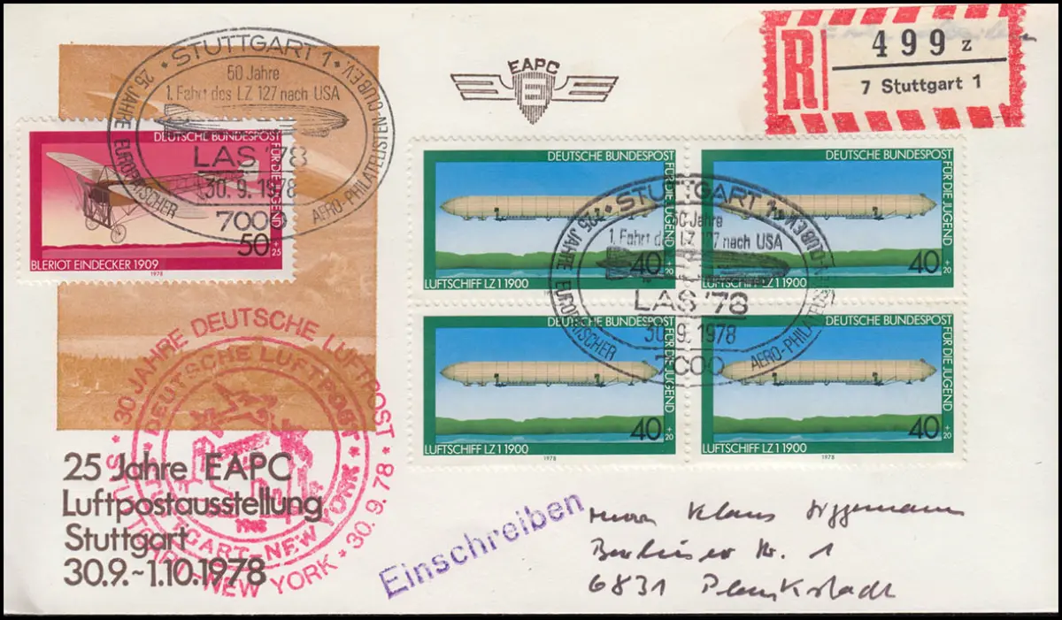 Drei Jubiläen: Stempel anlässlich des 50. Jahrestages 1. Zeppelinfahrt des LZ 127 nach USA / 30 Jahre Deutsche Luftpost / 25 Jahre EAPC - zu Luftpostausstellung Stuttgart 30.9.-1.10.1978