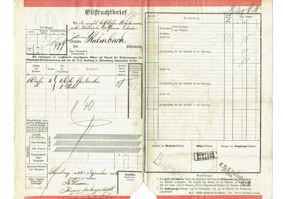 Frachtbrief 1902 Bamberg KISTE GARDEROBE MASKENGESCHÄFT an kath. PFARRER #115. Als Zustandsbeschreibung dient der Scan von Vorder- und Rückseite mit 300DPI-Qualität. Das originale Dokument kann aufgrund der Glättung beim Scan hier nicht sichtbare Risse / Einrisse / Abrisse aufweisen und aufgrund der Größe gegebenenfalls nicht in Gänze abgescannt worden sein.Fragen werden gerne beantwortet.dewabit