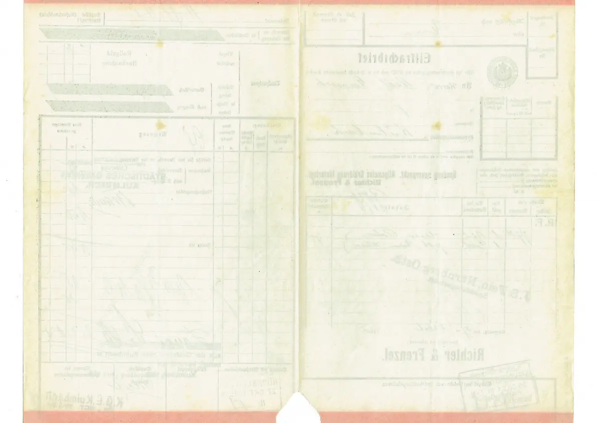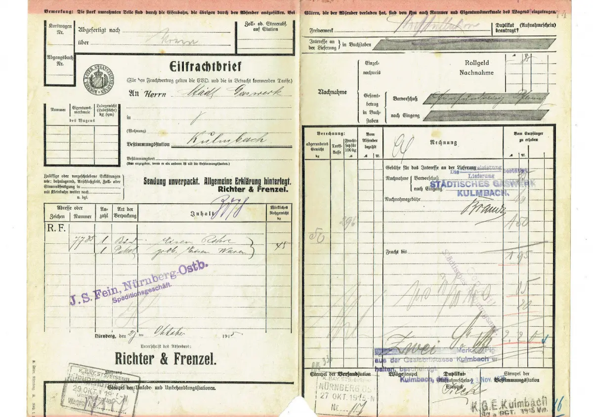 EILFrachtbrief 1915 NÜRNBERG Eisenrohre + grobe Eisenwaren nach KULMBACH #124. Als Zustandsbeschreibung dient der Scan von Vorder- und Rückseite mit 300DPI-Qualität. Das originale Dokument kann aufgrund der Glättung beim Scan hier nicht sichtbare Risse / Einrisse / Abrisse aufweisen und aufgrund der Größe gegebenenfalls nicht in Gänze abgescannt worden sein.Fragen werden gerne beantwortet.dewabit