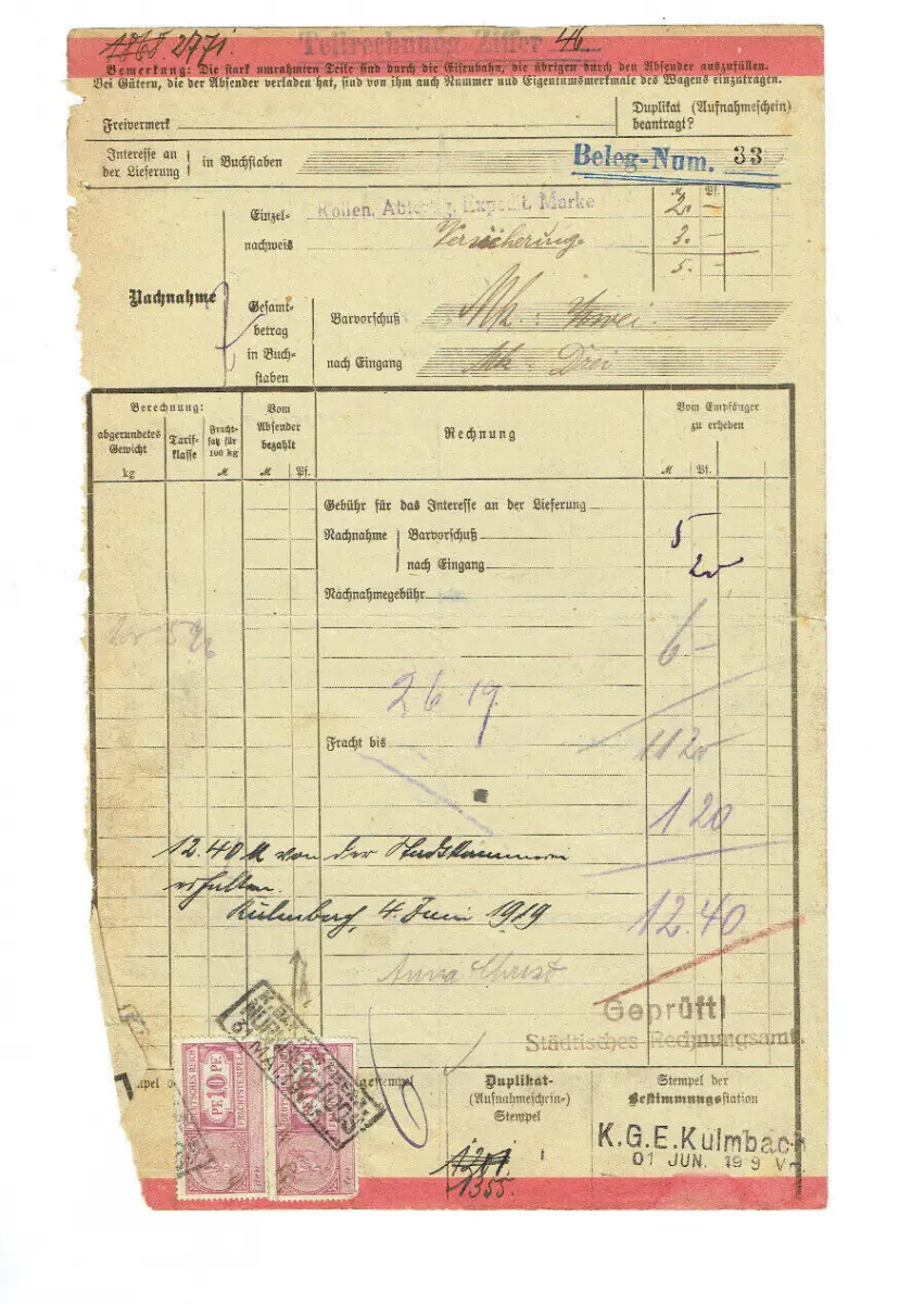 EILFrachtbrief 1919 KRIEGSNOTGELD Nürnberg Münzprägeanstalt #88. Als Zustandsbeschreibung dient der Scan von Vorder- und Rückseite mit 300DPI-Qualität. Das originale Dokument kann aufgrund der Glättung beim Scan hier nicht sichtbare Risse / Einrisse / Abrisse aufweisen und aufgrund der Größe gegebenenfalls nicht in Gänze abgescannt worden sein.Fragen werden gerne beantwortet.dewabit