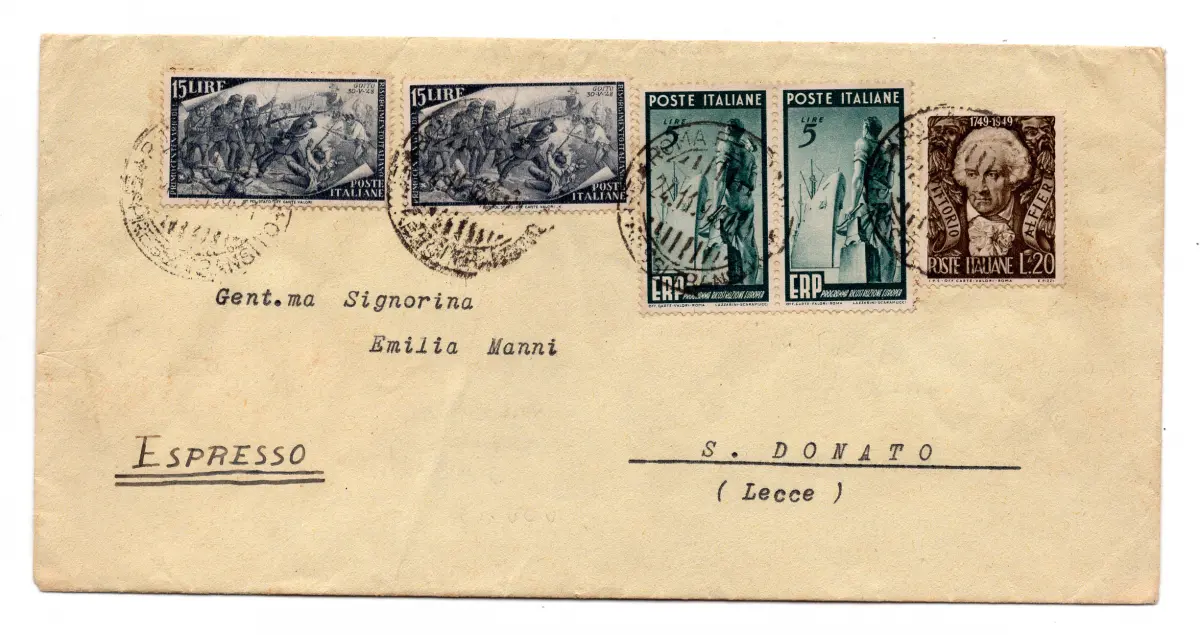 Umschlag - ERP Lire 5 Nr. 601 zwei Exemplare + Ergänzungen Nr. 587 x 2 + 605 auf Exp. von Rom nach San Donato am 24.11.49 - im Tarif - hoher Katalogwert Cod. 304/17
