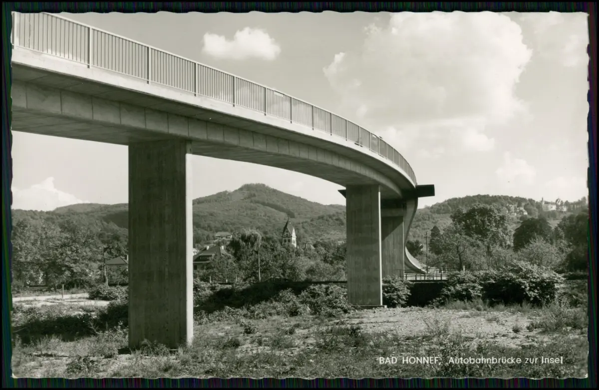 Bad Honnef am Rhein – beeindruckende Echtfoto-Karte aus dem Jahr 1962 mit moderner Autobahnbrücke zur Insel Grafenwerth, aufgenommen aus markanter Untersicht. Im Hintergrund ist die evangelische Erlöserkirche sichtbar, eingebettet in das Panorama des Siebengebirges.