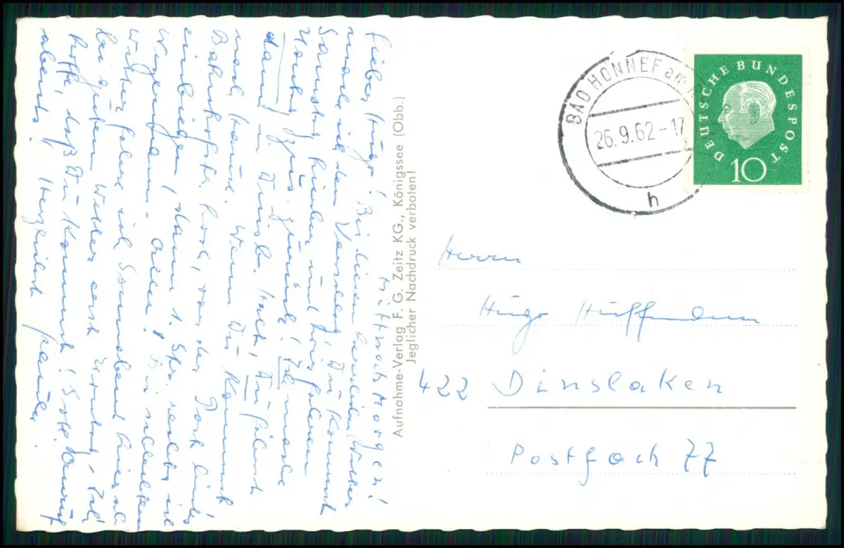 Poststempel Bad Honnef am Rhein, 26.09.1962, 10 Pfennig Heuss-Markenserie der Deutschen Bundespost, mit persönlichem Urlaubsgruß an Hugo Höffmann, Dinslaken.