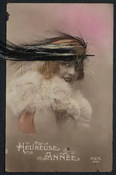 Echt-Haar-AK Dame im Pelz mit Federschmuck