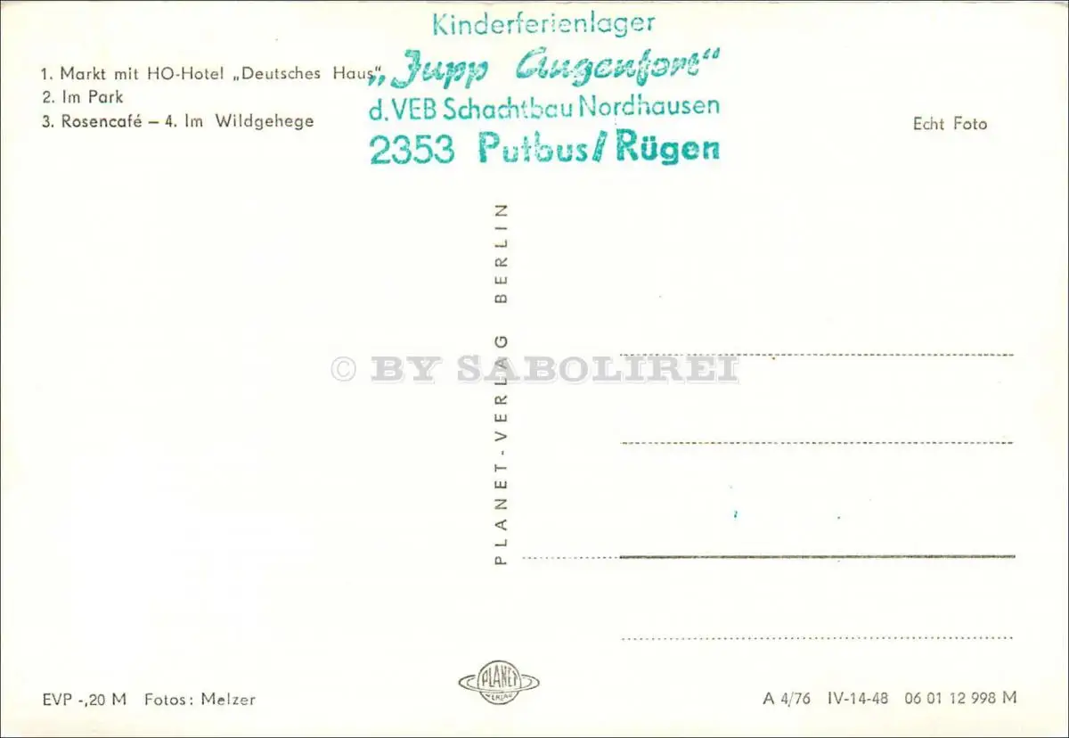 Motiv: 1. Markt mit HO-Hotel "Deutsches Haus", 2. Im Park, 3. Rosencafe, 4. Im Wildgehege. Verlagsangaben: Berlin, Planet-Verlag Berlin, 1976, 06 01 12 998.