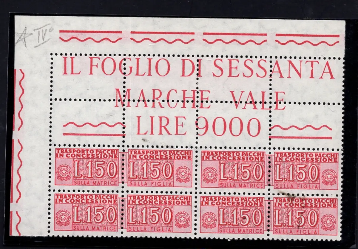 MNH Vollgummi - Konzessionspakete Lire 150 Nr. 16A Viertel mit Eckblock aus fluoreszierendem Papierpapier (Sass. Spec. Nr. BA43, Manelli Nr. 223A) - Selten - signiert Carraro Cod. 774/16