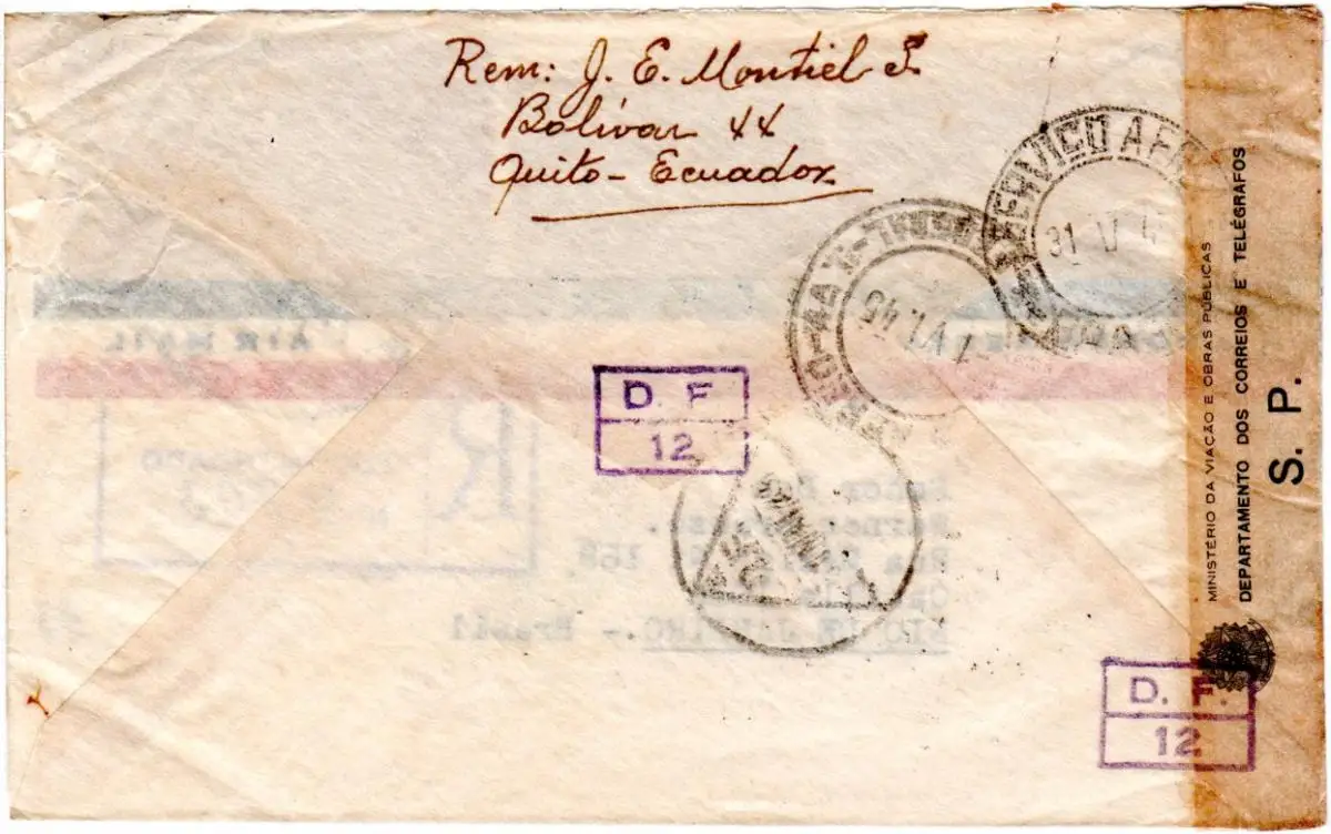 Ecuador 1945, 4 Marken auf Reko Luftpost Zensur Brief v. Quito n. Brasilien