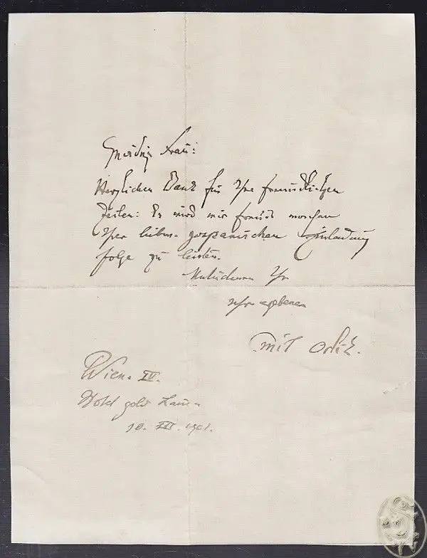 Bemerkungen: `Gnädige Frau: herzlichen Dank für Ihre freundlichen Zeilen: Es wird mir Freude machen Ihrer liebens- (...) Einladunng Folge zu leisten. Unterdessen Ihr sehr ergebener Emil Orlik, Wien IV, Hotel gold. Lamm . 10. III. 190. Emil Orlik war ein böhmischer Maler, Grafiker, Fotograf, Medailleur und Kunsthandwerker. Er war von 1899 bis 1905 Mitglied der Wiener Secession und veröffentlichte in der Secessions-Zeitschrift `Ver Sacrum`.