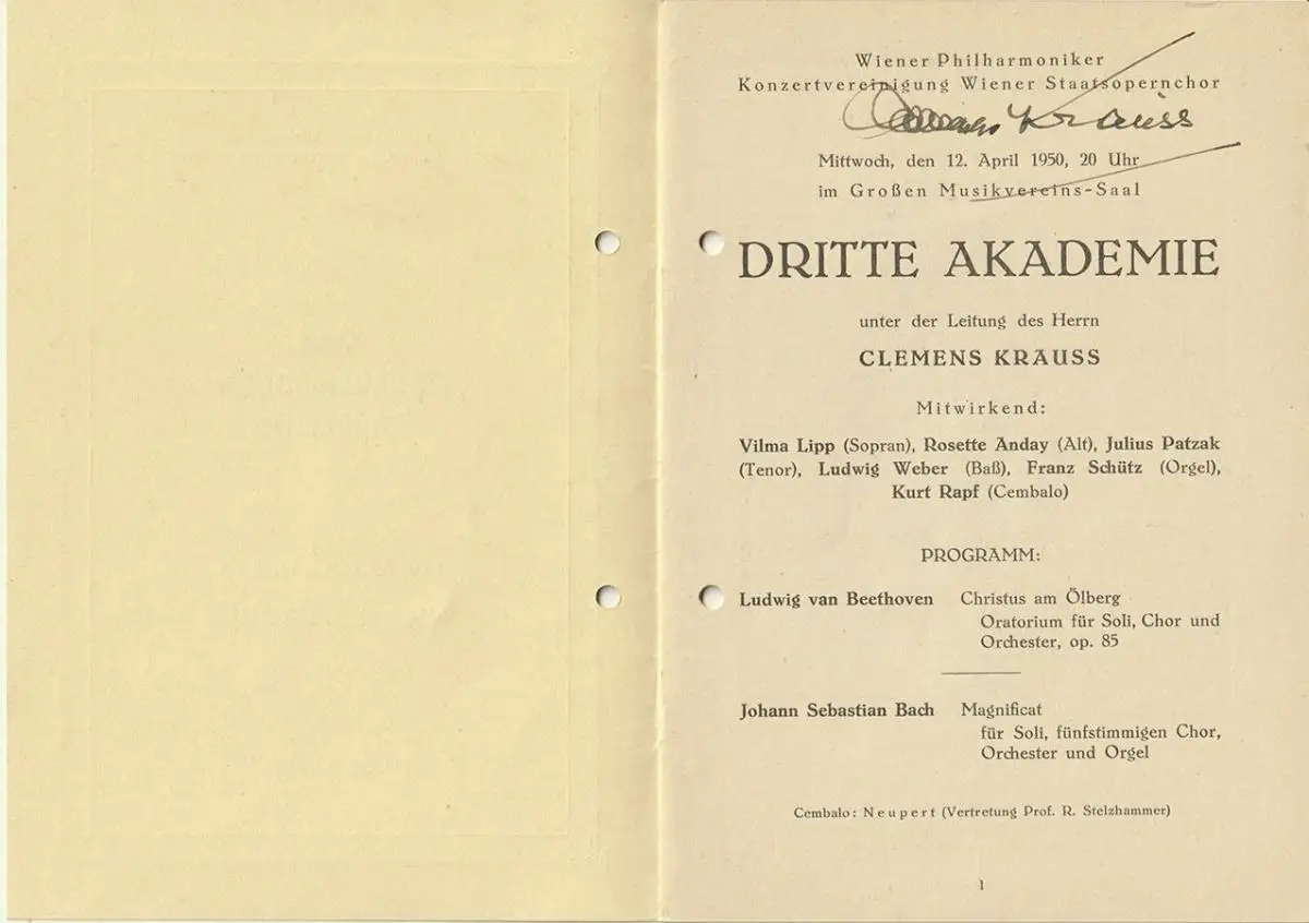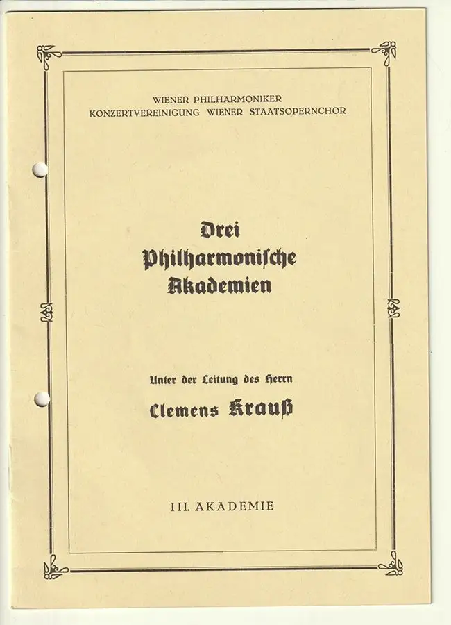 Bemerkungen: Titelblatt von Clemens Krauss (1893-1954) signiert. Krauss` Position gegenüber dem Nationasolzialismus gilt als umstritten, er arbeitete nach dem Krieg erst seit 1947 wieder an der Wiener Staatsoper. Er war in zweiter Ehe mit der Schauspielerin Viorica Ursuleac verheiratet.