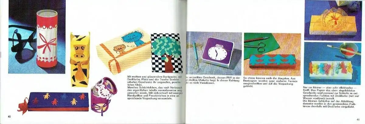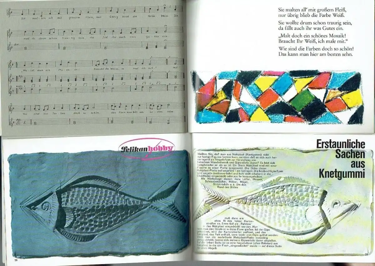 Spaß beim Basteln - Freude beim Schenken Dazu soll Ihnen dieses kleine Heftchen verhelfen. Viele Beispiele geben Anregungen für eine dankbare, sinnvolle Freizeitbeschäftigung. Alle Dinge sind - Lust und Liebe vorausgesetzt - auch vom Ungeübten leicht herzustellen. Die dazugehörigen Materialien können ohne Schwierigkeiten beschafft werden und erfordern keinen großen Geldbeutel. - Aller Anfang ist leicht - In diesem Kapitel finden Sie viele Anregungen darüber, wie man Flaschen, Gläser, Tabletts, Blumentöpfe, Bügel usw. bemalt, Papierkörbe bastelt und schönen Modeschmuck selbst herstellt. - Effektvoll und dekorativ — Sgraffito - Eine alte Technik — neu entdeckt für wirkungsvollen Wandschmuck und dekorative Schalen - Stoffdruck leicht gemacht    Lampen, Tischdecken, Kinderservietten, Wandbehänge und Schürzen — mit den einfachsten Mitteln selbst hergestellt. - Spieglein, Spieglein ...Eine etwas ausgefallene „Spiegel-Spielerei" für junge Damen. - Erstaunliche Dinge aus Knetgummi - Wer hätte das gedacht: ein Schachspiel, Glasmosaike und viele Negativformen für hübschen Wandschmuck — aus Knetgummi! - Ein Kasperletheater - Ein kleines Theater — komplett mit Kulisse für besonders geschickte Hände und 5 verschiedenen Puppen. - Hübsch verpackt ist doppelt geschenkt - Schmuckkästchen aus Apfelsinen (!), bemalte und beklebte Spanschachteln, verkleidete Flaschen und originelle Glückwunschkarten. - Und das brauchen Sie dazu - Welches Material Sie benötigen, wo Sie es bekommen und was es kostet, erfahren Sie auf den letzten Seiten. "Kleinkinder denken noch nicht begrifflich abstrakt, sondern anschaulich konkret. Mit dem Tastsinn, dem Geschmack, dem Gehör und dem Auge erobern sie Stück für Stück des Lebens und dessen Wirklichkeit. Darauf muß die mütterlich sorgende und liebende Pädagogik im Alltag des Kindergartens bauen. Ein Stück dieser Arbeit verwirklicht das Märchen von den Farben der Schwester Petronia aus einem Kindergarten in Kaiserslautern. Mit ihm erleben die Kinder bewußt die Farben und ihre Grundordnung, eine selbsterzeugte Musik auf dem Orffschen Instrumentarium, Rhythmus und Melodie; in der Aufführung der Farbenkantate vor den Eltern sind sie aber zum ersten Male echte Akteure auf einer Bühne. Diese liebenswerte Art der Einführung des Kindes in das Leben und dessen Kategorien soll durch dieses Heft allen Freude machen, die selbst mit der musischen Jugendbildung verbunden sind ..."