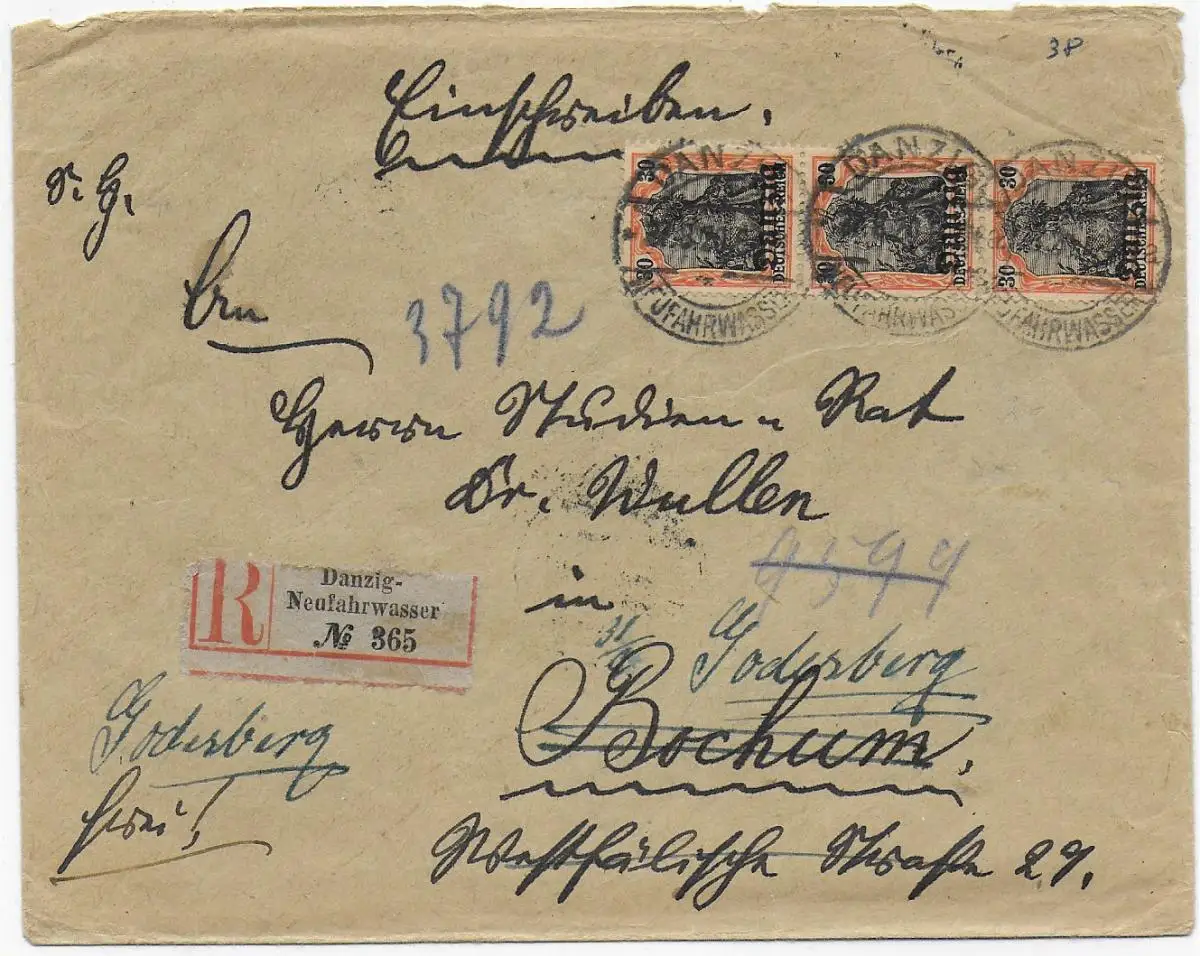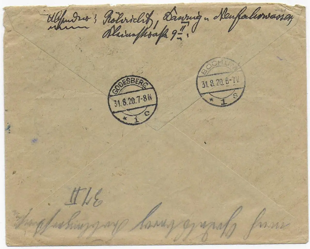 Einschreiben Danzig Neufahrwasser, 1920 nach Bochum, Weiterleitung Godesberg
