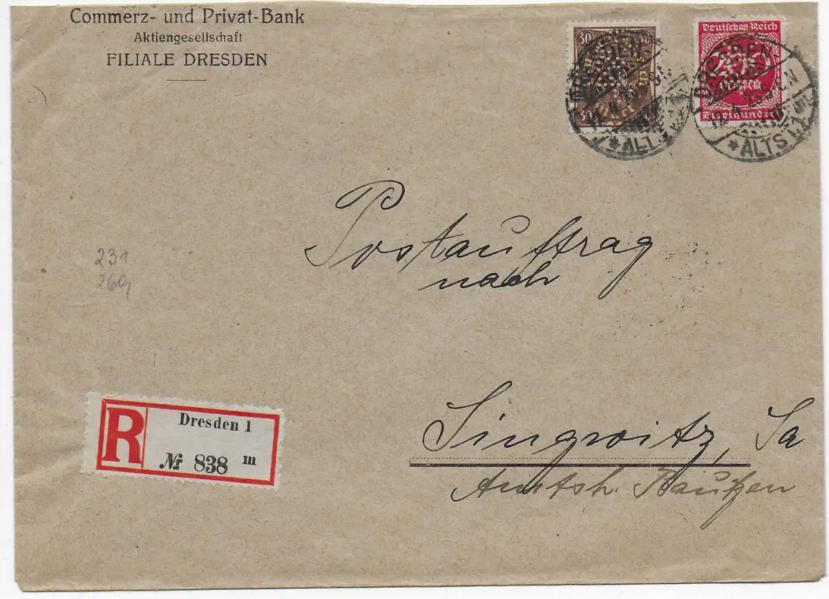 Einschreiben Dresden Commerzbank nach Singwitz, Perfin (Lochung), 1923