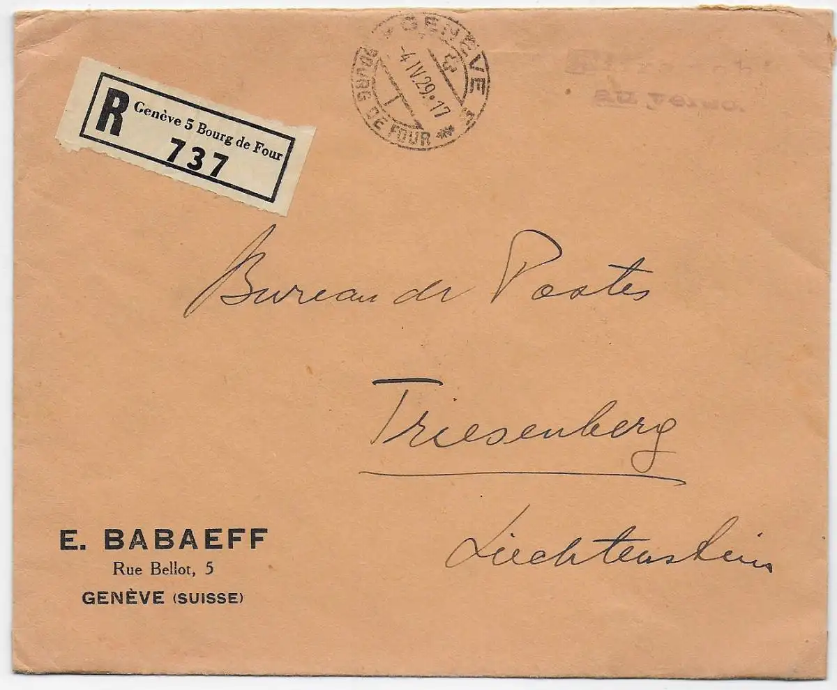 Einschreiben Genf, 1929 nach Triesenberg/Li