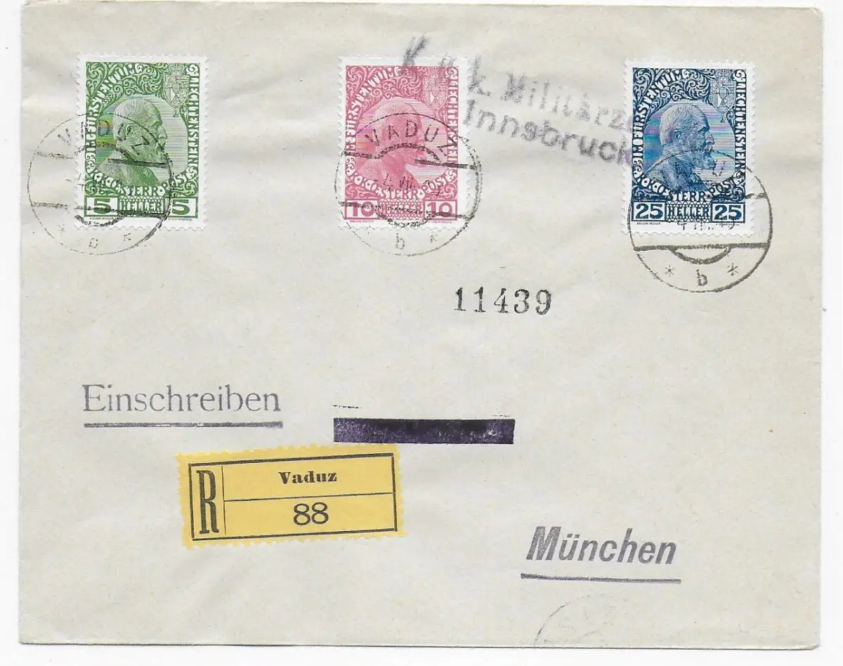 Einschreiben Vaduz, MiNr. 1-3, nach München 1915
