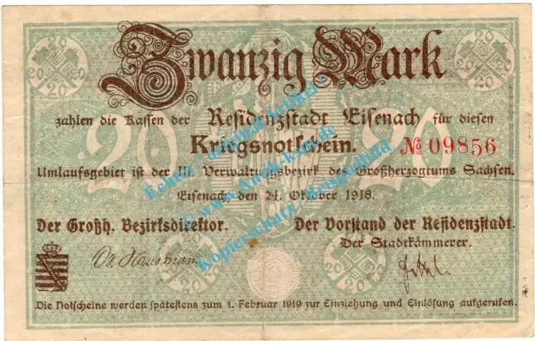 Eisenach , Notgeld 20 Mark Schein in gbr.E Geiger 121.03 , Thüringen 1918 Grossnotgeld