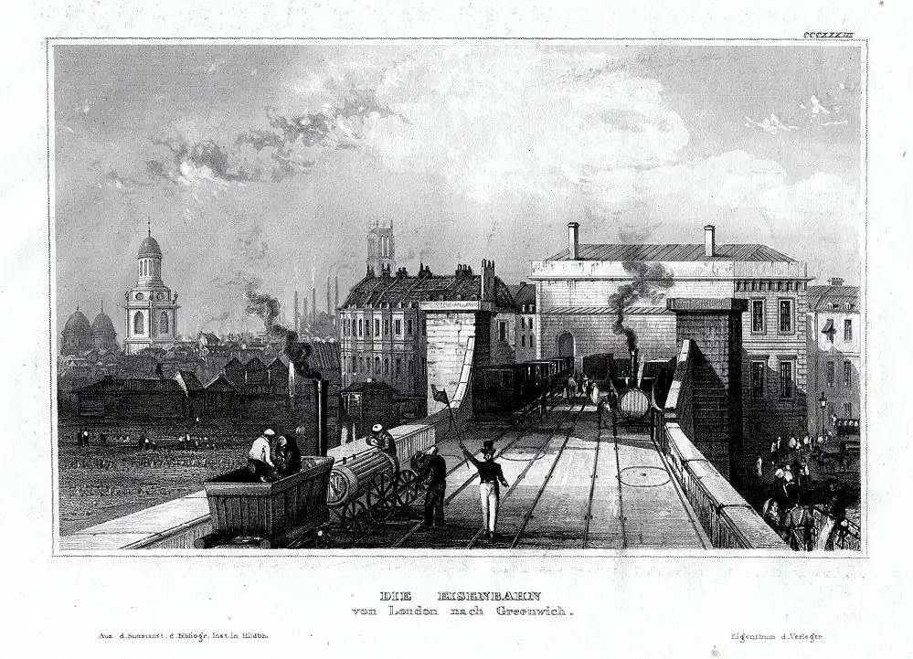 Eisenbahn London nach Greenwich. Originaler Stahlstich um 1850