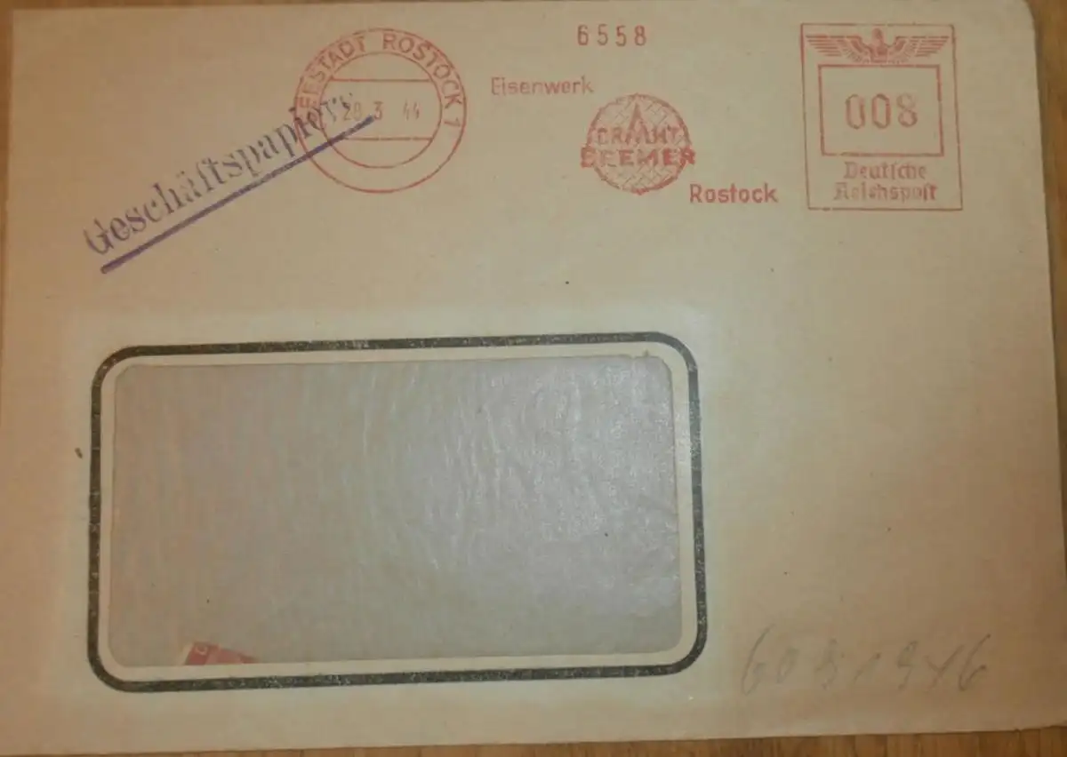 Eisenwerk Draht-Bremer in Rostock i.M., 1944 , alter Briefumschlag , Stempel , Reklame , Mecklenburg !!AZ-WR/1N