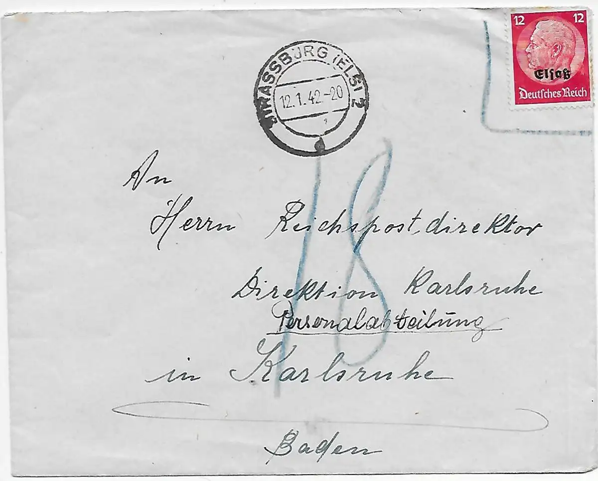Elsaß: Strassburg 1942 nach Karlsruhe - Reichspostdirektor