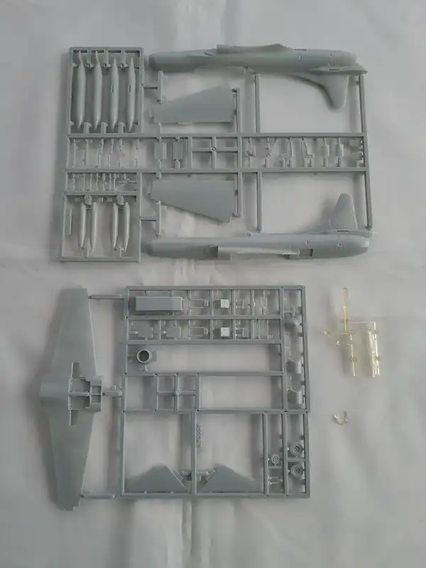 Einzelteile (Plastikbauteile) sind noch am Rahmen fixiert, 1 Teil (Clearpart) befindet sich nicht am Rahmen.