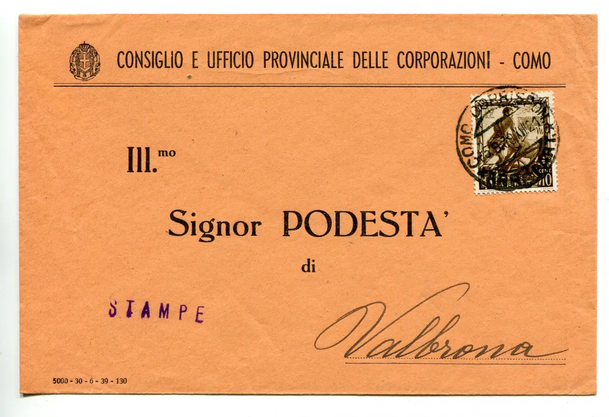 Empire Cent. 10 isoliert auf Empire Cent Umschlag. 10 Nr. 439 isoliert auf Umschlag (Drucke) von Como nach Valbrona am 5.9.39 - Seltene einmalige Verwendung Cod. 249/A
