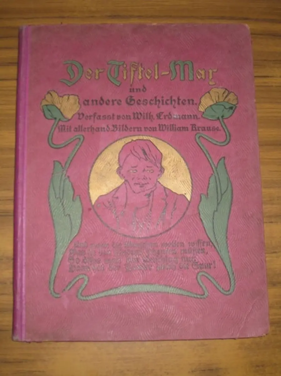 Freie Beschreibung: 4° (31,5 : 23,5 cm). Violetter Original-Halbleinenband mit farbiger Deckelillustration in Jugendstilornamentik. Der Einband entwas berieben, an den Ecken durchstoßen, im Randbereich gedunkelt. Hinterer Deckel mit größerem Feuchtrand. 32 nicht paginierte Blätter, davon nur das erste mit Titel und rückseitig Vorwort beidseitig bedruckt. Mit zahlreichen Illustrationen von William Krause In Farblithographie. Vor allem in den Rändern etwas Braun- und fingerfleckig. Klammern etwas rostig. Noch gutes Exemplar