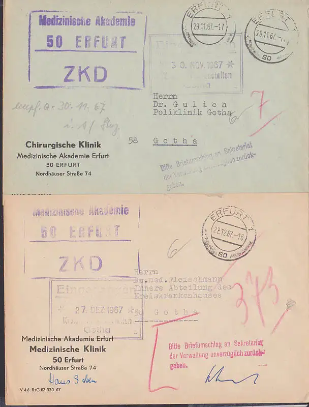 Erfurt R3-ZKD-St. mit Z3 in rot bzw. vilett "Bitte Briefumschlag an Sekretariat .."