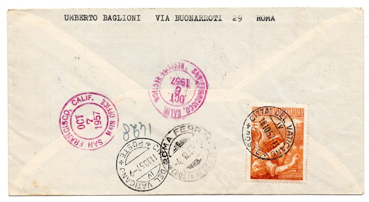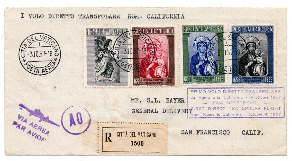 Erstflug TWA (Vatikan) / Rom Transpolarflug vom 4.10.57 - Aerogramm Racc. nach San Francisco mit Jungfernflug - nebenan Ann. violett (Kat. Pellegrini Nr. 259IN) - Ungewöhnlich, 20 transportiert - Euro-Bewertung 150/200 Nr. 1351/A