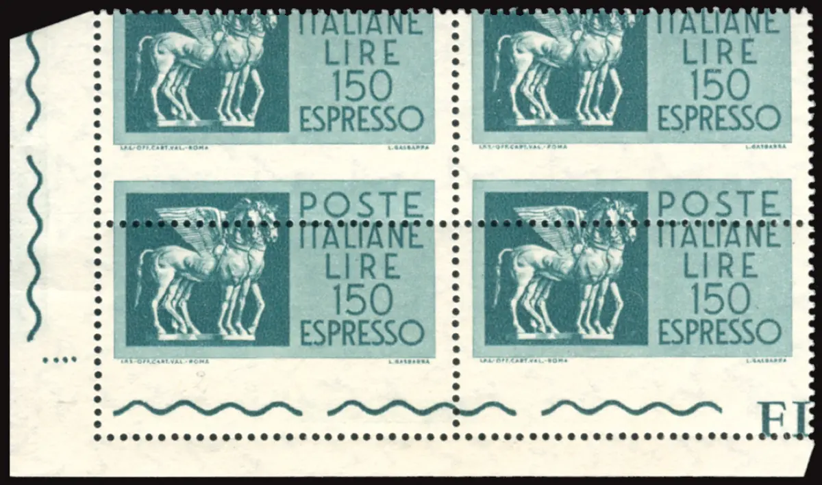 Espresso Lire 150 Cavallo Alato Sorte Verzahnung Vollgummi MNH - Espresso Lire 150 Cavallo Alato Nr. 36b Viertel a. von f. mit stark nach unten verschobener horizontaler Verzahnung - Schriftzug Post auf zwei unteren Exemplaren (Sass. n. 36c) - Selten - Kat. 1.000 Cod. 762/16