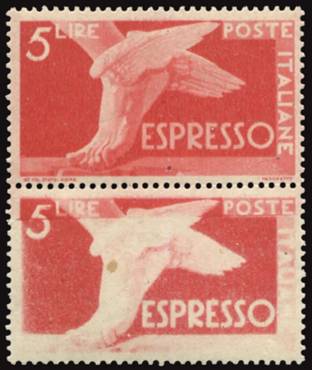 Espresso Lire 5 Democratica unvollständige Drucksorte Vollgummi MNH - Espresso Lire 5 Democratica Nr. 25b vergänglicher unvollständiger Druck paarweise mit normalem Exemplar (siehe Anmerkung Kat. Sachsen) - Linguella-Spur am normalen Exemplar - G. Bolaffi - Kat. 350 Cod. 755/16
