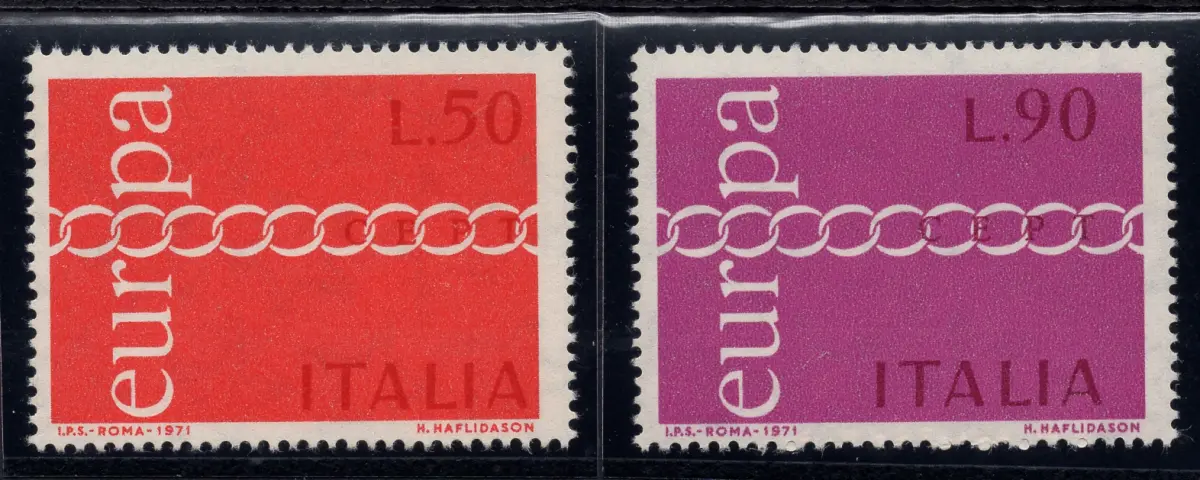 Vollgummi MNH - Europa '71 Nr. 1147/1148 Zwei-Wert-Serie mit stark verschobenen Farben - CEPT-Schriftzug, der aus den Ringen austritt, wenn er zu Pferd positioniert Cod. 539/15