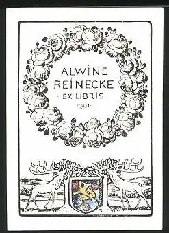 Exlibris Alwine Reinecke, Hirsche flankieren Wappen, Rosenkranz