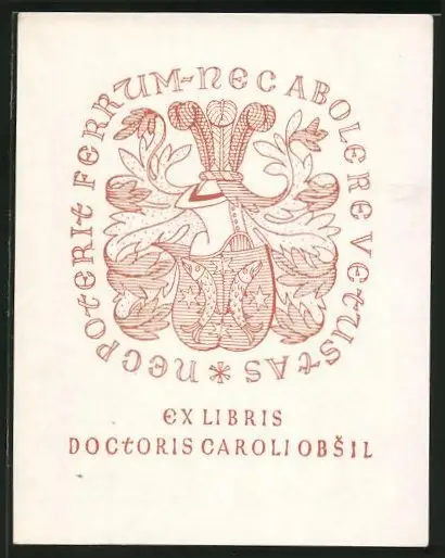 Exlibris Doctoris Caroli Obsil, Wappen mit Fischen & Ritterhelm