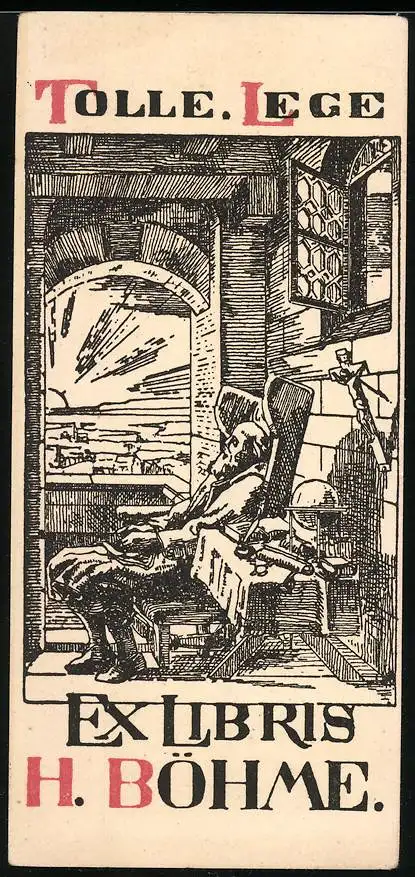 Exlibris H. Böhme, Tolle Lege, Gelehrter in seinem Arbeitszimmer sitzend