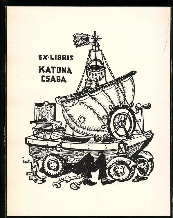 Exlibris Katona Csaba, Segelboot wird zum Amphibienfahrzeug umgebaut
