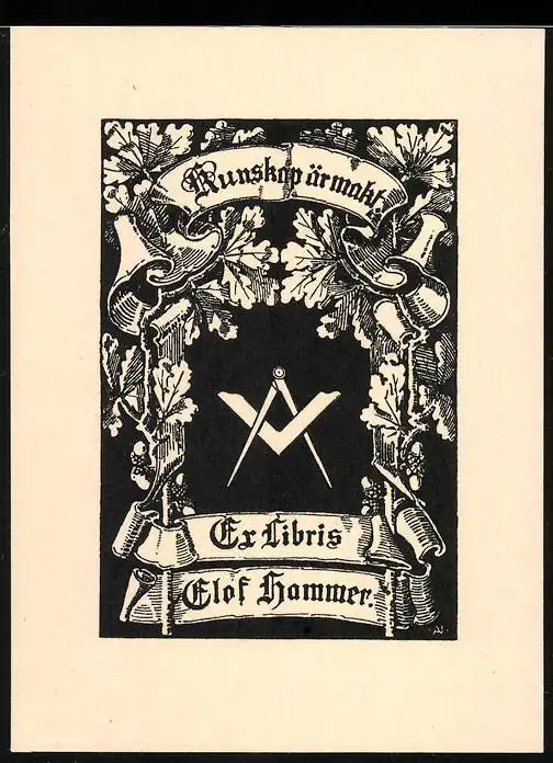Exlibris Olaf Hammer, Eichenlaub und Freimaurer-Symbolik Winkel und Zirkel