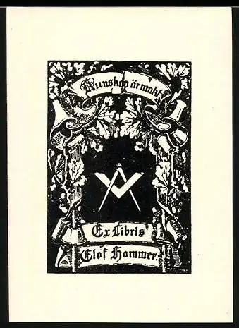 Exlibris Olaf Hammer, Freimaurer Symbole Zirkel und Winkel umgeben von Eichenlaub