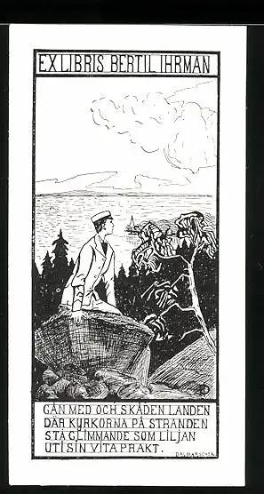 Exlibris von Dalmarschen für Bertil Ihrman, Student vor Panorama mit Gewässer