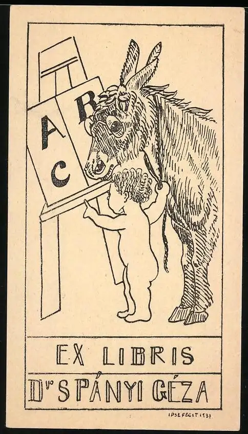 Exlibris von Dr. Spanyi Geza für Dr. Spanyi Geza, Knabe erklärt Esel das Alphabet