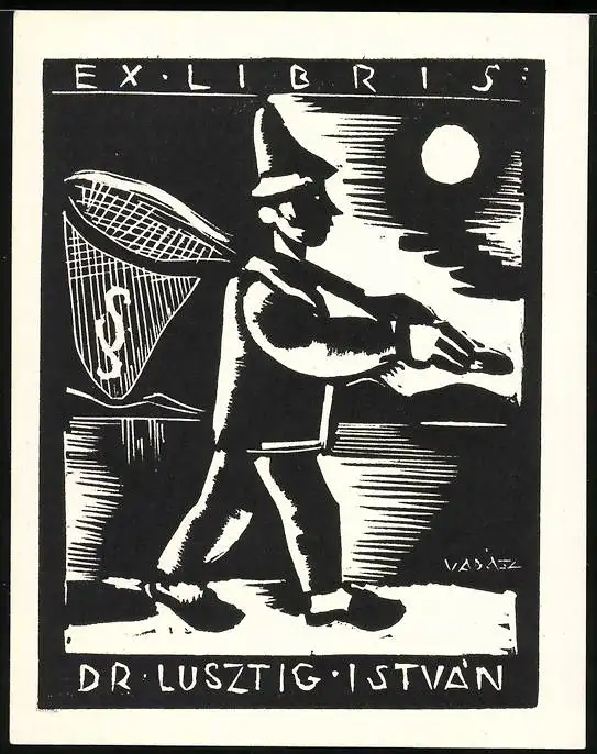 Exlibris von Vadasz für Dr. Lusztig Istvan, Fischer mit Paragraphenzeichenzeichen im Kescher