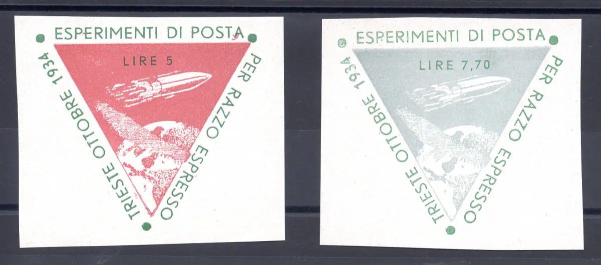 Experimente Posta Rakete Espresso - Die beiden Erinnophilen - Experimente Posta Rakete Espresso - Die beiden dreieckigen Erinnophilen (ohne Wasserzeichen) von Lire 5 und 7,70 für das Triest Experiment vom Oktober '34 in der Farbe rot und grau - ohne Gummi wie gewohnt - Ungewöhnliche Nr. 187/20